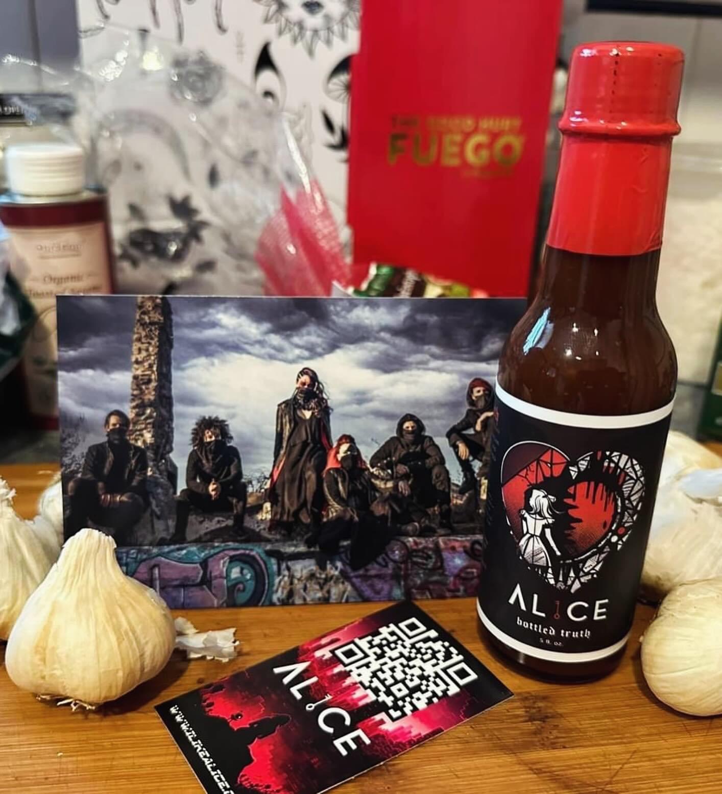 Made by our fan, friend and Mad Hatter Steven Baker, the "Bottled Truth" hot sauce is a dream come true in a bottle of deliciousness. It is the most unique and delicious hot sauce we've ever experienced and it is the first of its kind: The "Bottled Truth" AL1CE hot sauce!!